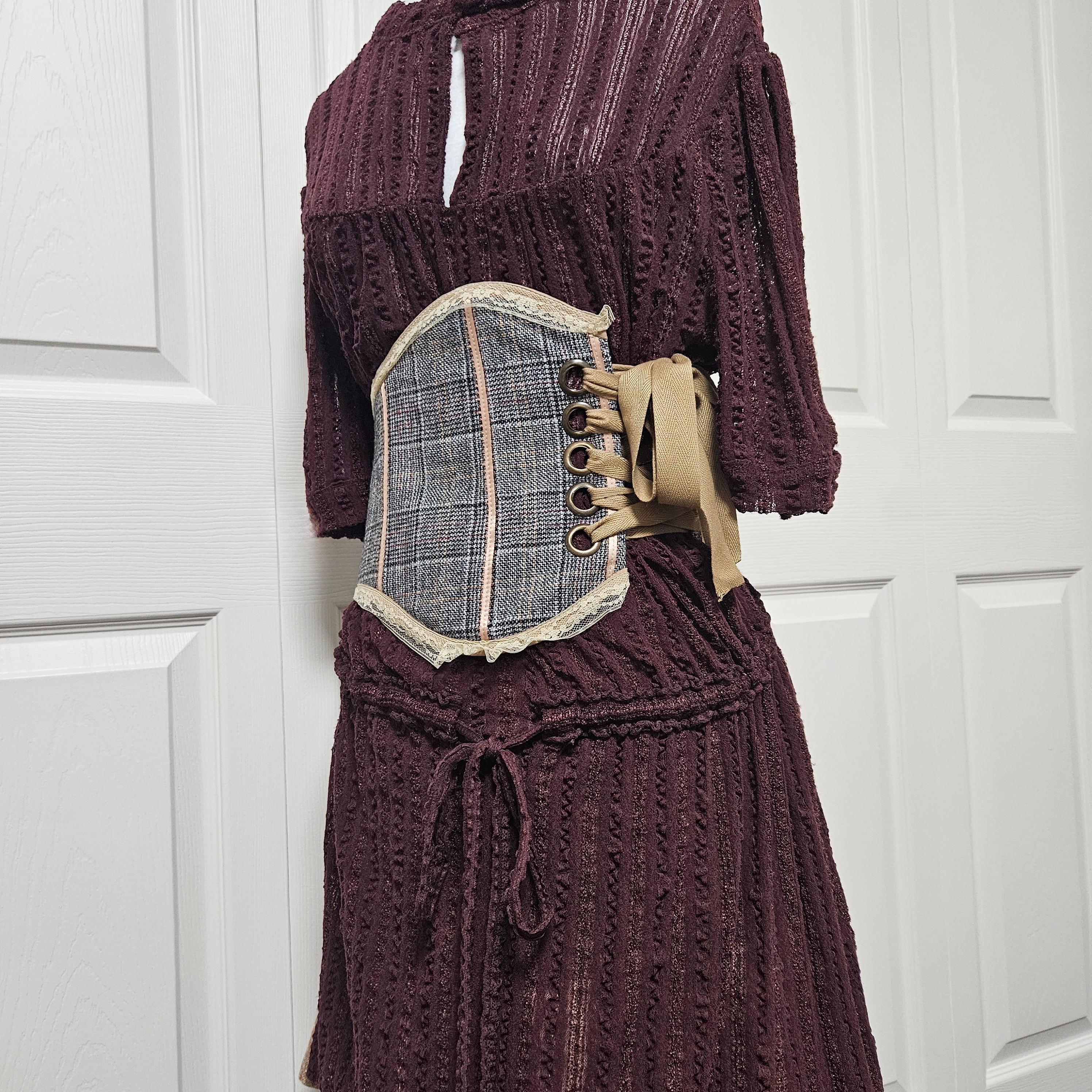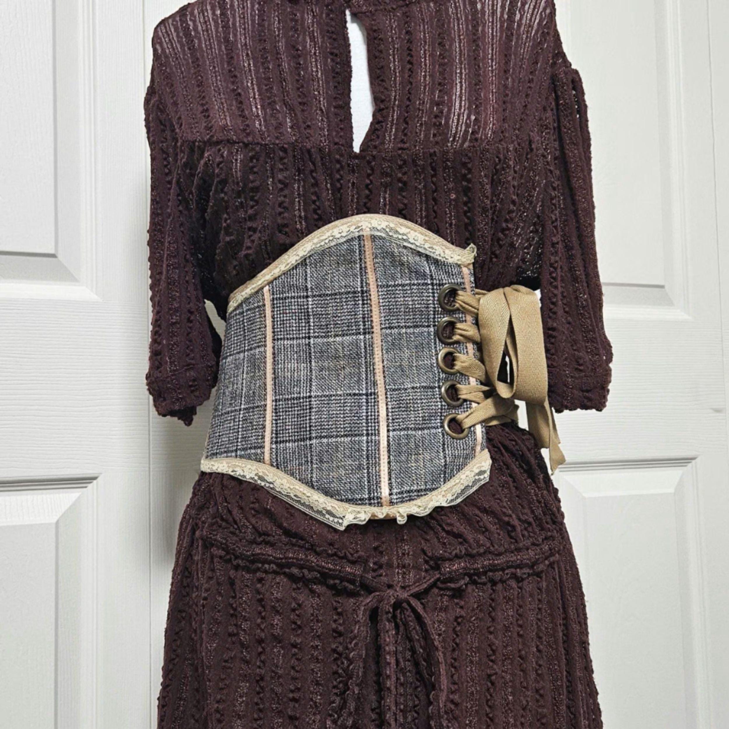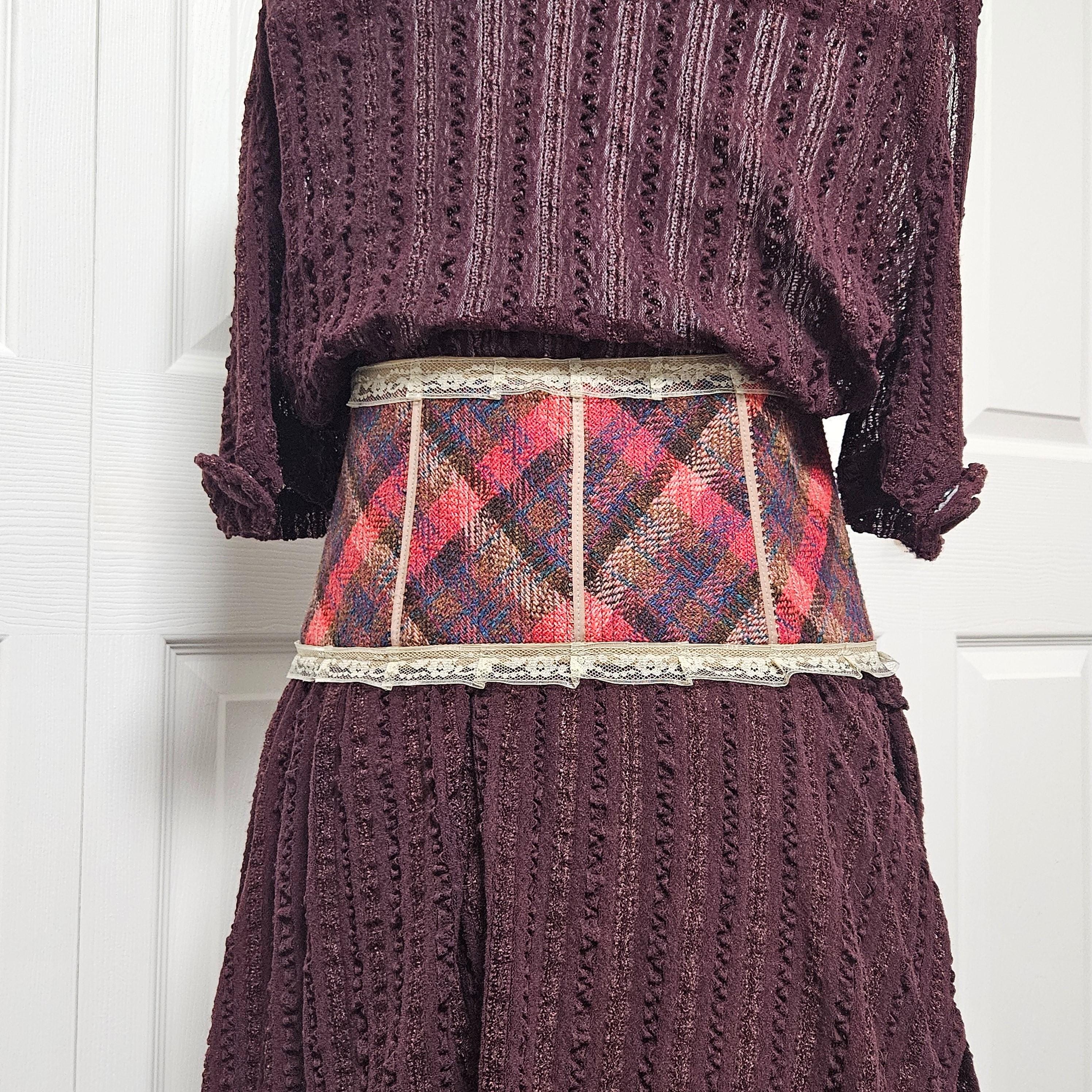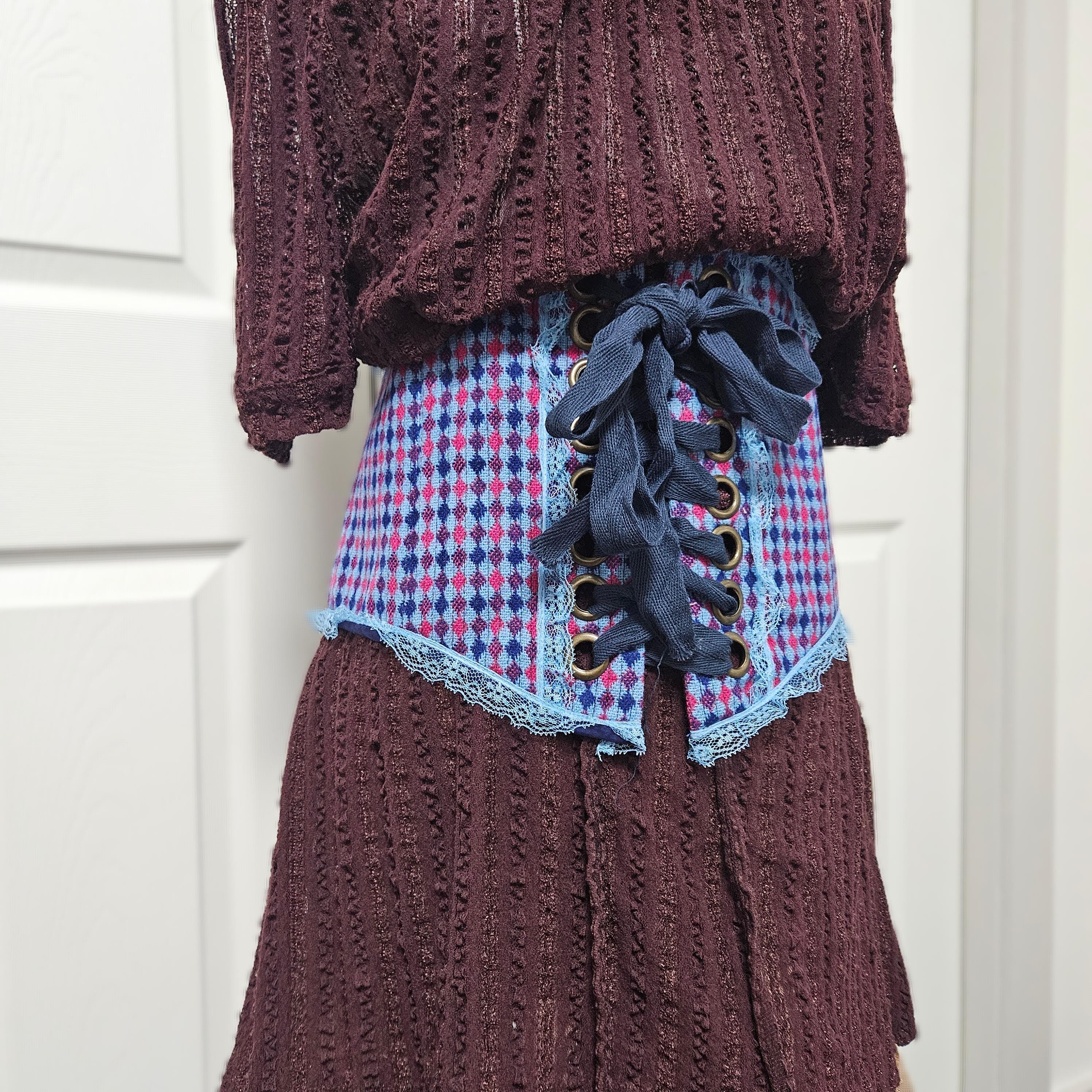 These wool corset belts are vintage inspired and handmade from eye-catching deadstock woolen fabrics in sizes S to XXL. Designed to sit at the waist and define your silhouette, the front features a structured panel with a smooth, flattering finish that pairs beautifully over dresses, blouses, or even outerwear.