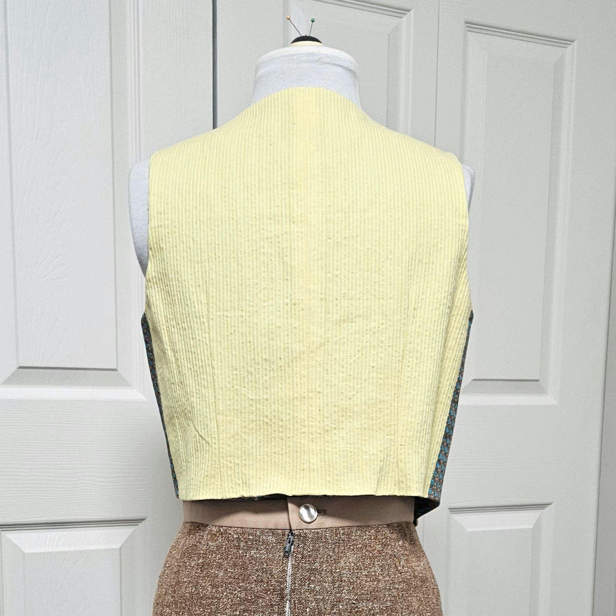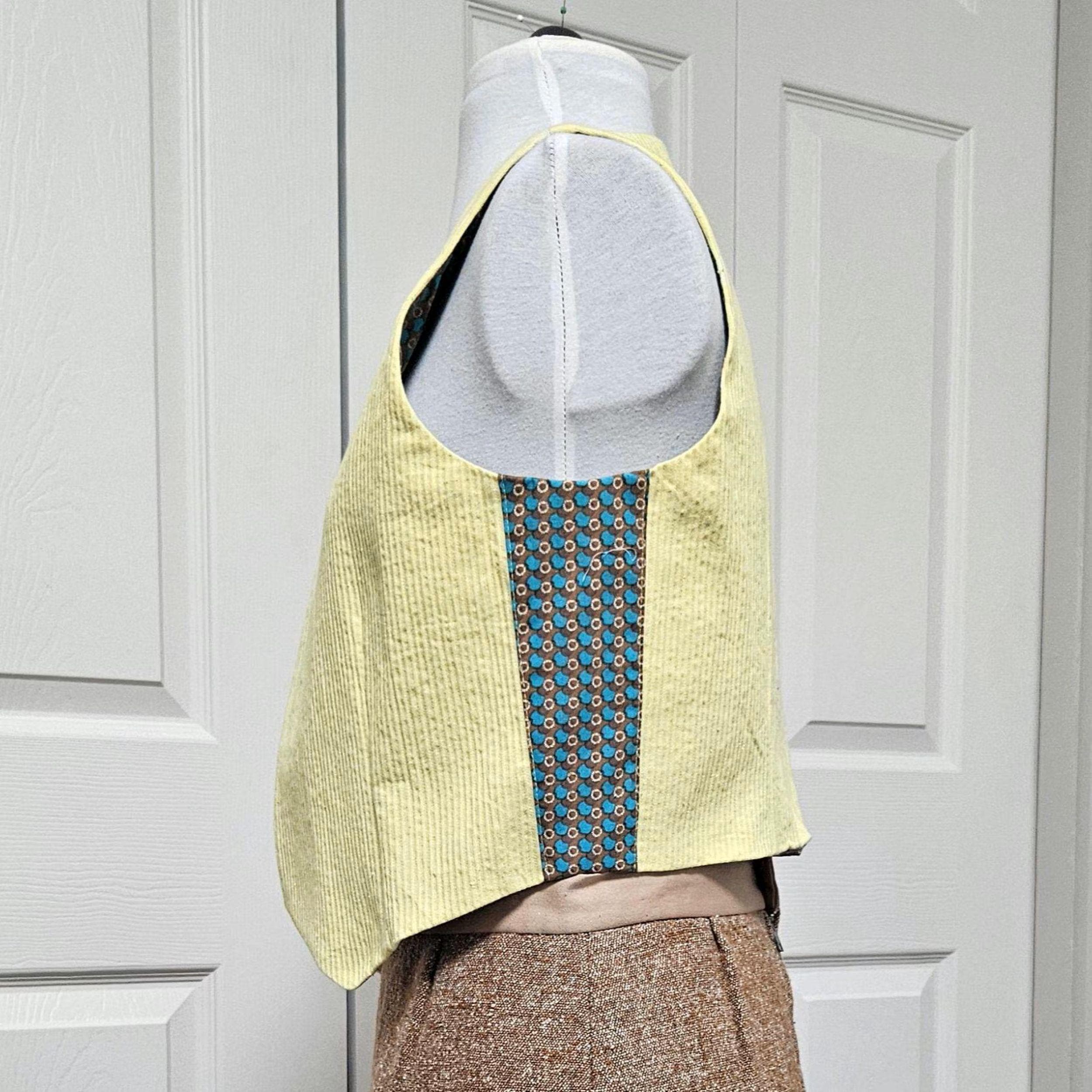 This handmade yellow corduroy vest is crafted from high quality deadstock fabrics for a stylish, sustainable statement. Each vest is carefully constructed with contrast sides and lining, offering a playful twist on classic vintage design. Inclusive one size, see measurements below.