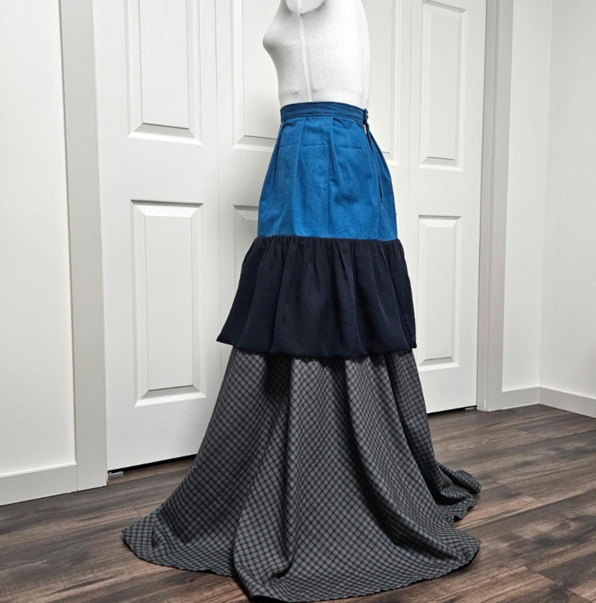This vintage inspired blue whimsigoth tiered maxi skirt is lovingly handmade from deadstock fabric in size 6. Crafted with care and sustainability in mind, this unique one of a kind piece breathes new life into unused textiles, making it truly a unique piece. The flowing silhouette and rich blue hue capture the free-spirited essence of classic peasant skirts, perfect for adding a touch of boho elegance to your wardrobe.