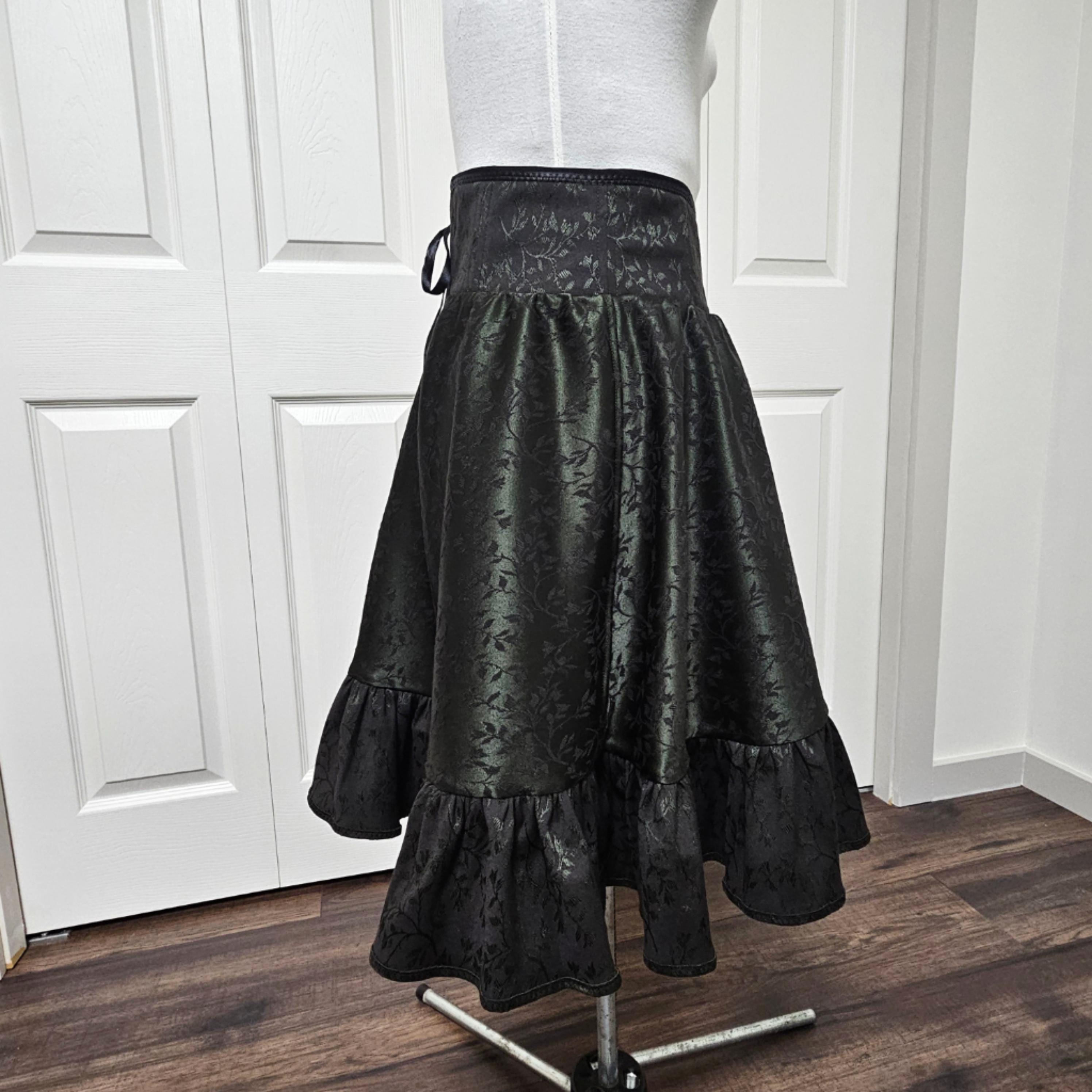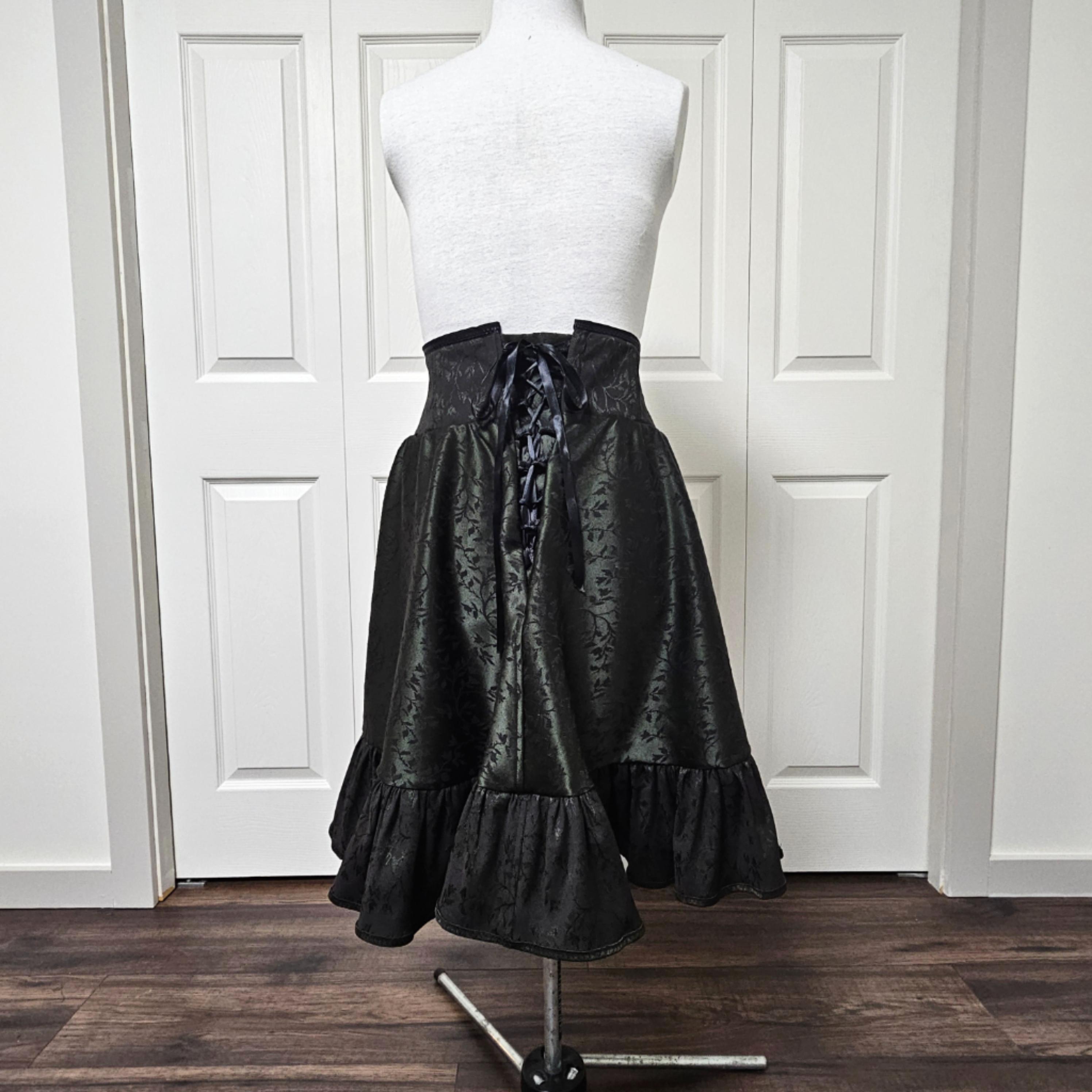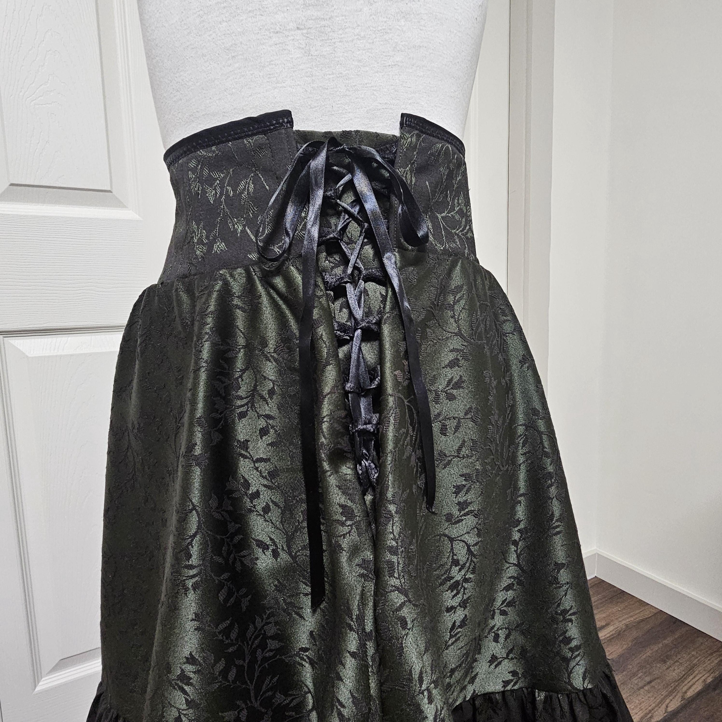 This corset ruffle skirt is handmade from deadstock black and deep green jacquard fabric, making it a one of a kind skirt. The high structured waistband features a drawstring corset back that adjusts to fit comfortably from 25" - 29" (XS-M), giving both shape and flexibility.