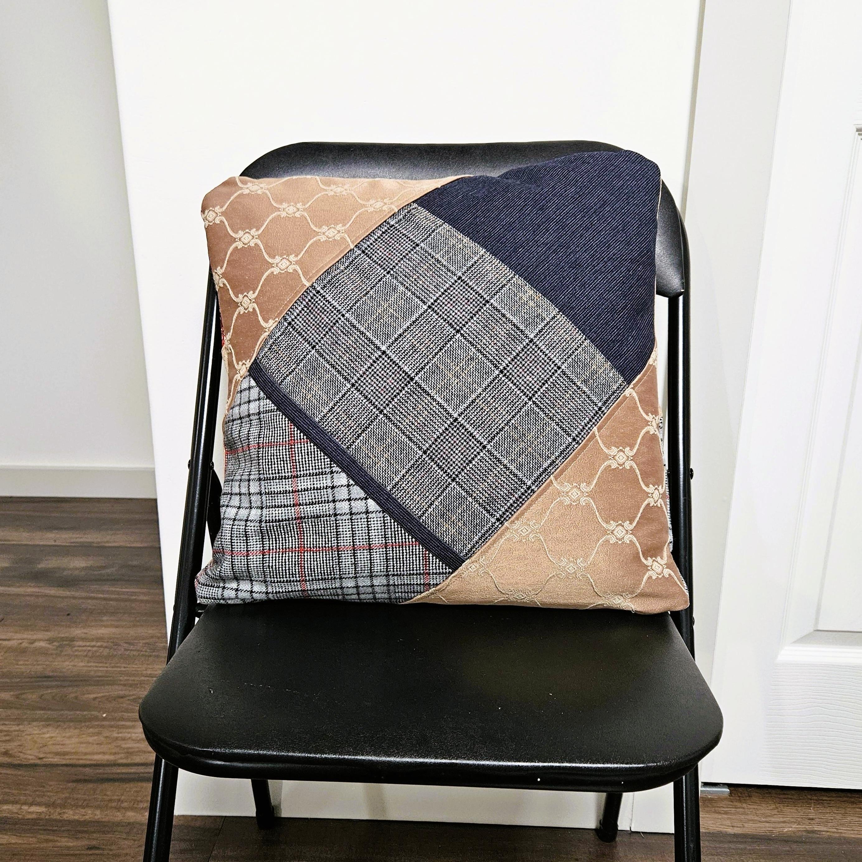 Set of two handmade 16x16 throw cushion covers, thoughtfully crafted from reclaimed and deadstock fabrics. Each cover features a red-toned patchwork front and a blue-toned patchwork back, offering two distinct looks in one beautifully made set.