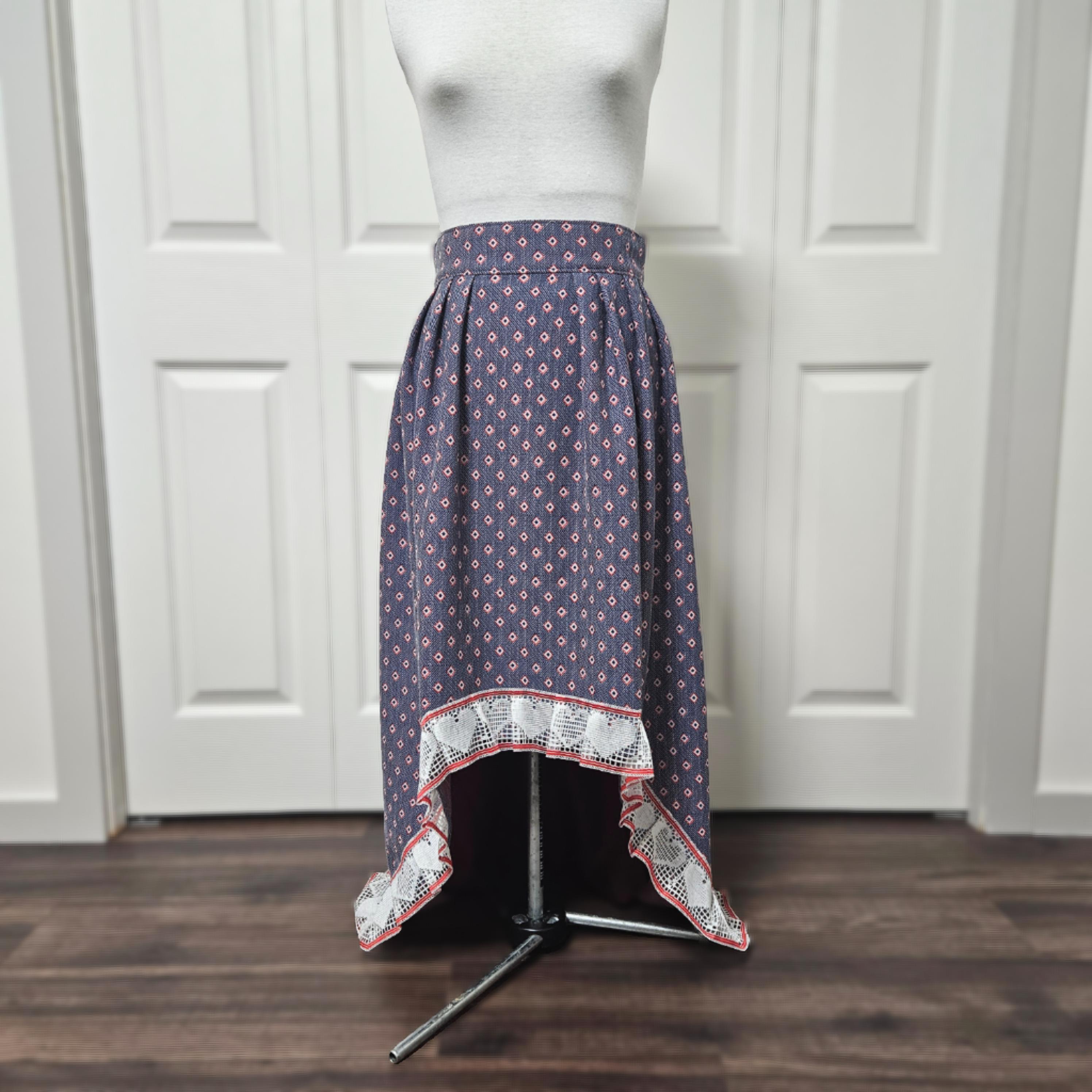 This vintage inspired navy pleated skirt was carefully handmade using deadstock fabric. The size 12 one of a kind piece features elegant pleats, a flattering high-waisted A-line silhouette, and a high to low length that adds classic charm to any outfit.