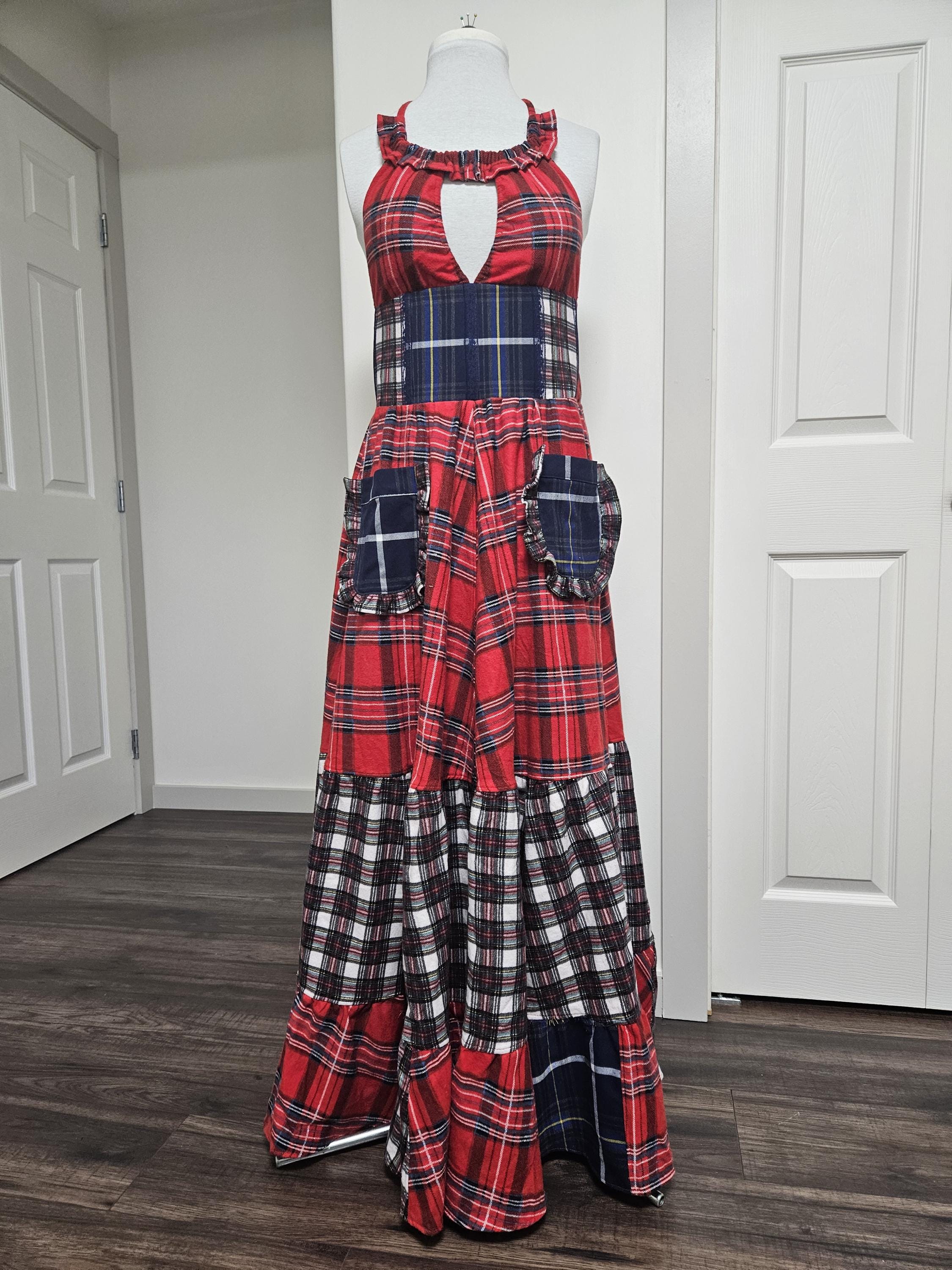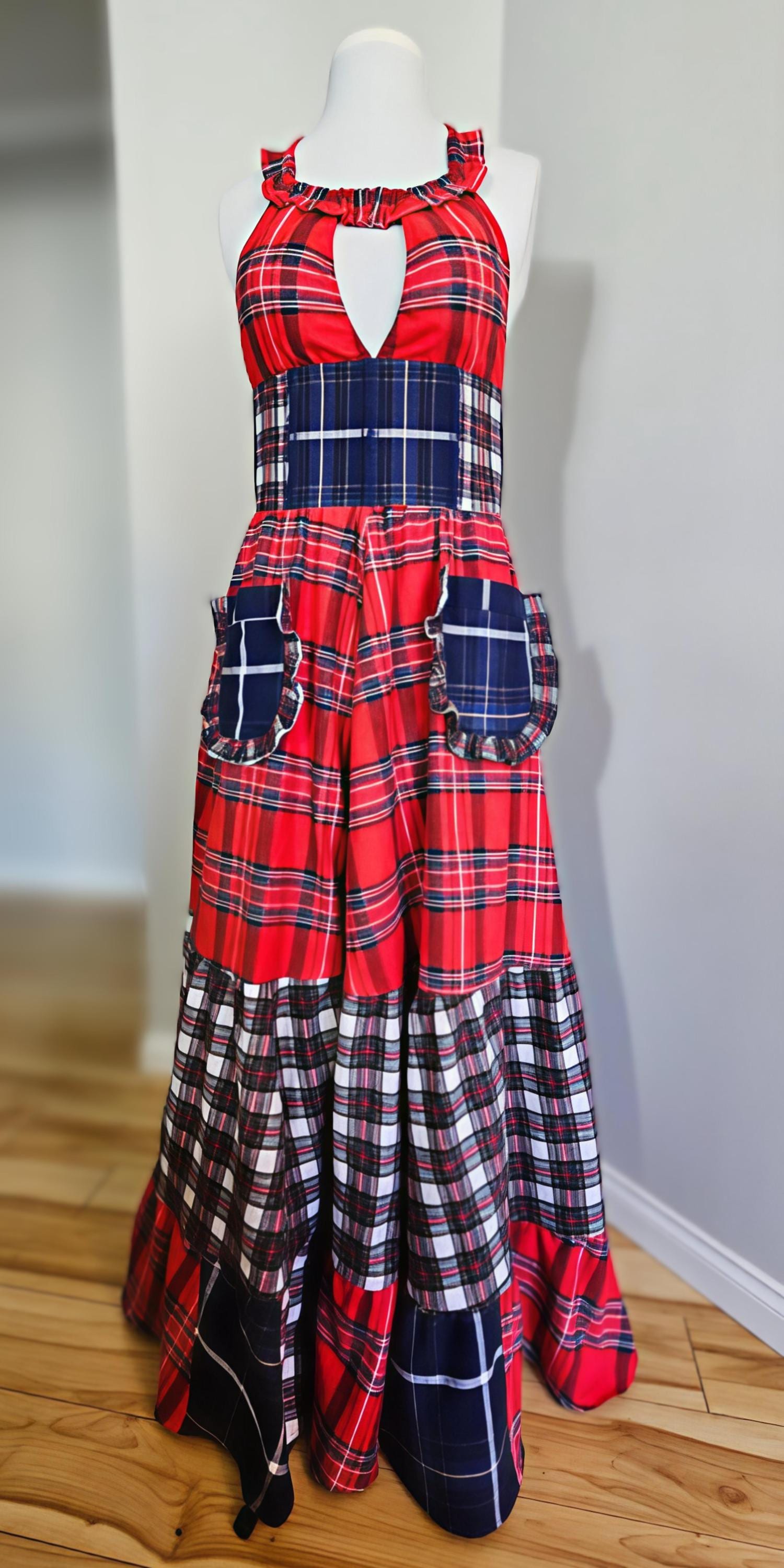 This plaid halter maxi dress is a one-of-a-kind patchwork boho gown that blends artistry, comfort, and conscious design. Handmade from carefully selected deadstock and reclaimed 100% cotton fabrics, each panel is thoughtfully arranged and stitched into a flowing, tiered silhouette full of color, texture, and movement.