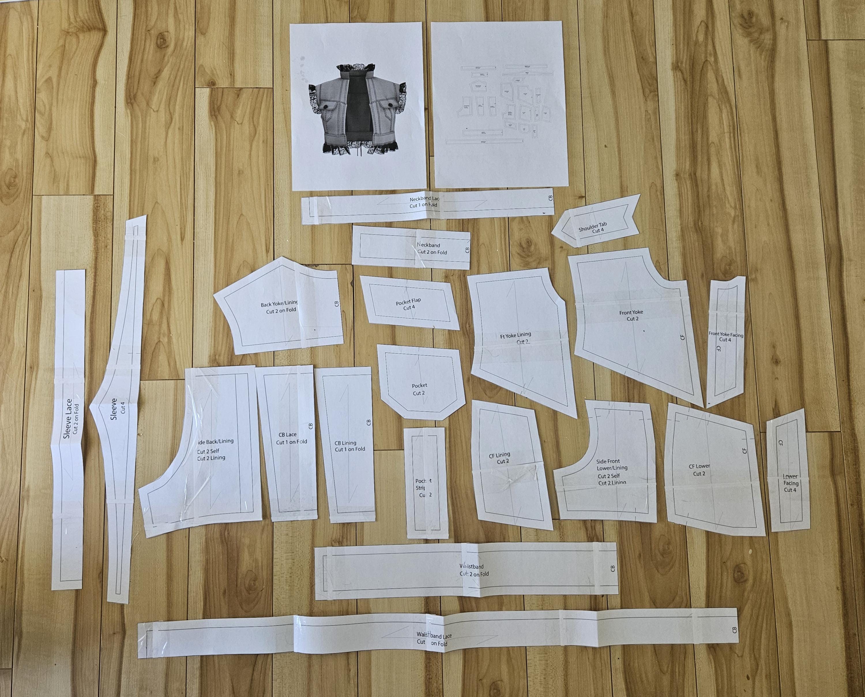 This step is slow, but in the best way. I take my time aligning registration marks, smoothing out tape, and making sure every line flows cleanly across the pages. Once the full pattern is taped together, I carefully cut each piece out, scissors gliding across the paper, following the lines I drew on screen days before.